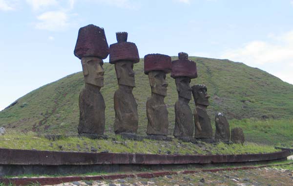 indtil den stille og roligt selv vippede på plads. Ved Anakena-stranden er der