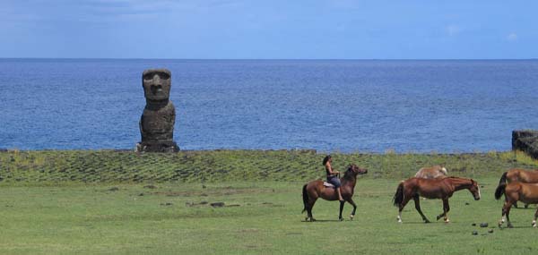 Efter at have spist vores frokost – i køletasken med sandwiches, vandmelon og kildevand – drog vi videre til øens vel nok mest imponerende ahu, Ahu Tongariki. Statuerne her blev, som så mange andre, væltet under borgerkrigene, men genrejst i 1900-tallet. De blev imidlertid væltet og mere eller mindre ødelagt og flyttet rundt af en voldsom tsunami i 1960. Derefter lå de meget spredt og delvis ødelagte i mange år, indtil de i 1995 blev genrejst af japanere – eller i hvert fald for japanske midler. På trods af tsunamiens voldsomhed, kom der nu ingen mennesker til skade, primært fordi tsunamien kom fra et jordskælv i Chile – og altså fra øst. Og den eneste bebyggelse på øen, Hanga Roa, ligger på den sydvestlige side.