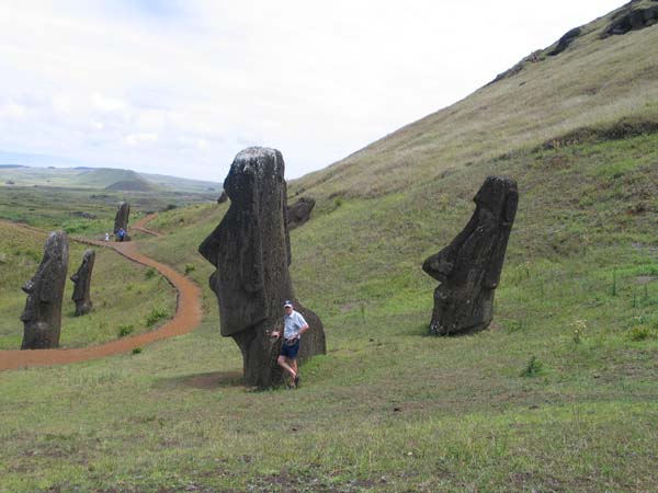Med opbydelse af lidt fantasi kan man i øvrigt ane den ”sti” som statuerne ” gik ad” på deres vej ud til deres ahuer ude på øen. Netop Thor Heyerdal beviste at det kunne lade sig gøre at flytte en moai ved at lade den stå oprejst, og rokke den med tovværk fra toppen, og flytte højre side i bunden, når moaien får lagt vægten over på venstre side – og vice versa. Ligesom når man rokker et køleskab eller en vaskemaskine på plads. 15 mand kunne på denne måde flytte en 20 tons tung statue ca. 100 m om dagen. Det skal nu siges at denne teori har mange modstandere, og ingen ved jo hvordan de blev transporteret. Men at det er en mulighed – det er bevist.
