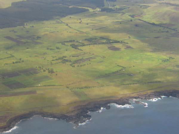 Vi tog først ud til byens nordside, hvorfra vi ifølge vores kort skulle kunne komme ud på en tur nord for byen. Vi kunne imidlertid ikke finde en vej her, der så bare rimelig farbar ud. Så efter nogle forsøg forsøgte vi at køre ”den anden vej” rundt, altså ud langs sydkysten, hvor vi så drejede fra til venstre da vi var kommet tilpas langt uden for byen. Der stod da også her på en sten eller et skilt at vejen førte til Ahu Akivi eller ”de 7 moaier”. Vejen var virkelig meget primitiv, men vi kom da ud til Ahu Akivi – det næsten eneste sted hvor moaierne kigger ud mod vandet. Men de står jo altså også et par kilometer inde i landet (en enkelt moai nede ved havnen kigger også ud over vandet – men det er nu nok en fejl i forbindelse med genrejsning). Herude ved ahuen, mange kilometer fra nærmeste hus, sad en ung mand og solgte de meget lækre ananasser, som vi selvsagt ikke kunne stå imod. Vejen videre blev mange steder ekstremt dårlig, så vi var glade for at det var en 4-hjulstrækker, vi kørte i. Ikke fordi vi brugte 4-hjulstrækket, men fordi den havde stor frihøjde. Der var mange steder store sten på vejen, som ville have stødt mod en ”normal” undervogn.