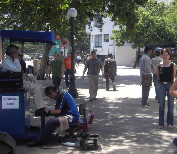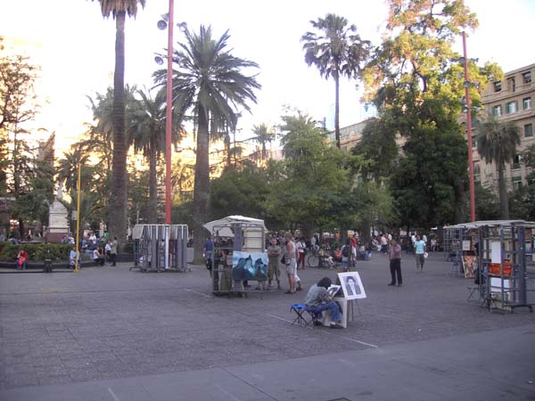 Efter byrundturen gik vi lidt i Bellavista-området, hvor vi havde læst at der skulle være mange restauranter og andet der var værd at se på. Der var nu ret kedeligt, det virkede som et temmelig øde industrikvarter. Vi gik derfor lidt den anden vej ad Avenida Providencia, indtil vi kom hen til metrostation Manuel Montt, hvorfra vi tog metroen ind til Universidad de Chile, og gik op til Plaza de Armas, ligesom vi havde gjort dagen før. I dette kvarter var der i hvert fald liv med masser af optræden, forretninger og meget andet. Men som nævnt ikke mange restauranter, ud over fast food-restauranterne.