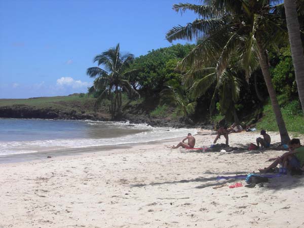 Efter denne tur kørte vi op til Anakena-stranden, hvor vi lagde os et par timer og slappede af i skyggen fra en palme. Man følte sig virkelig hensat til en idyllisk tropeø, når man sådan ligger og daser i palmeskyggen. Dog nok med risiko for at blive mål for nedfaldende kokosnødder!