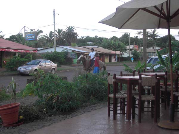 Efter hjemkomsten til Hanga Roa lagde vi os lidt og slappede lidt mere af, før vi skulle ud at spise. Vi gik hen ad hovedgaden, og fandt nogle hyggelige steder. Det første sted havde de faktisk kun én ting – nemlig tun. Der stod ganske vist en masse andre ting på spisekortet, men de kunne altså kun byde på tun. Det andet sted vi forsøgte, så da også hyggeligt ud, men de havde heller ikke så meget af det der stod på spisekortet. Vi blev dog dette andet sted, og endte med at spise en ret med tun – dels marineret, dels skiveskåret, og dels grillet. Det smagte nu udmærket, men det var lidt generende at der ikke var meget lys. Da mørket faldt på, sad vi næsten i bælgravende mørke og spiste. Men smagen var der altså ikke noget at kritisere på.