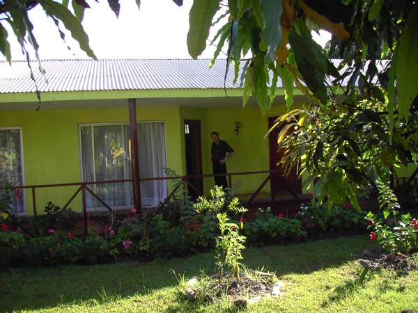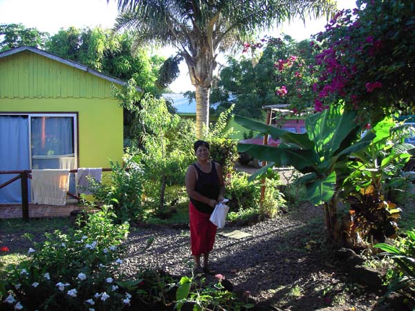 Hotellet – eller rettere sagt vores hostel, som de kalder det, idet det vel nærmest er en slags Bed and Breakfast – er primitivt, men charmerende, og i hvert fald i overensstemmelse med hvad vi havde forventet. Garderoben består af en bambusstang på ca. 2 m mellem to vægge, og der er (desværre) ikke køleskab. Erika tager sig imidlertid selv godt af sine gæster, stedet ligger perfekt tæt på centrum i stille og smukke omgivelser, og der er en udmærket anretning til morgenmad. Og idyllen understreger Erika selv med sin standardbemærkning ”no problemas”. Og bemærkningen ”cremas” samtidig med at hun gned sig på armene hørte vi også tit. Hun har utvivlsomt set mange gæster blive røde og solskoldede fordi de har undervurderet solen på Påskeøen.